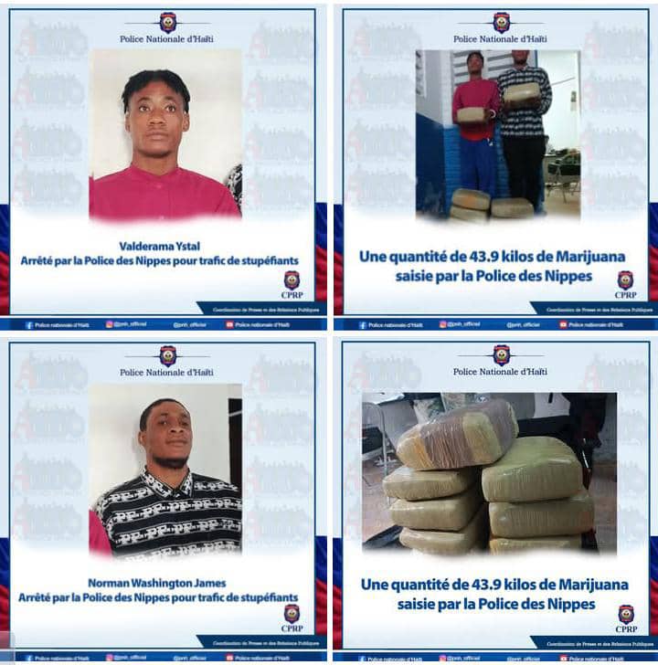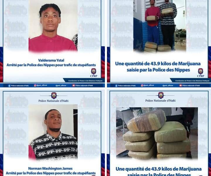 Les deux suspects, Valderama Ystal, originaire des Cayes (département du Sud), né le 14 novembre 2002, et Norman Washington James, de Saint-Louis du Sud, né le 20 novembre 2002, ont été arrêtés alors qu’ils circulaient à moto. Chacun transportait une valise contenant des stupéfiants, qui, après vérification, se sont révélés être 43,9 kilogrammes de marijuana.