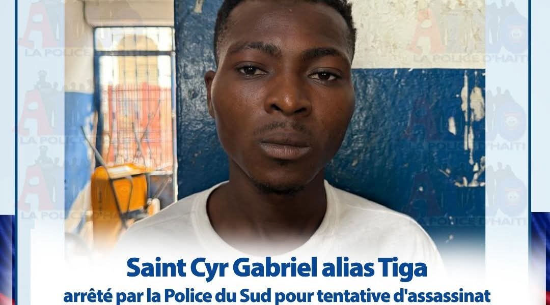 La Police Nationale d’Haïti (PNH), via sa Direction Départementale du Sud, a procédé à l’arrestation de Saint Cyr Gabriel, également connu sous le sobriquet de “Tiga “, pour des faits de tentative d’assassinat.
