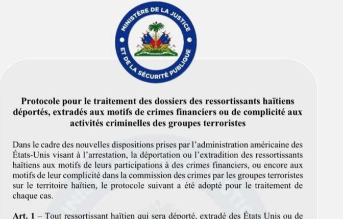 « Tout ressortissant haïtien impliqué dans des affaires de crimes financiers ou terroristes fera l’objet d’un traitement judiciaire rigoureux dès son retour au pays ». Par ces mots, le Ministère de la Justice pose le ton. Avec ce nouveau protocole, publié officiellement ce mois de juillet 2025, l’État haïtien entend renforcer sa coopération avec les autorités étrangères, notamment américaines, en matière d’extradition, de déportation et de lutte contre le crime organisé transnational.