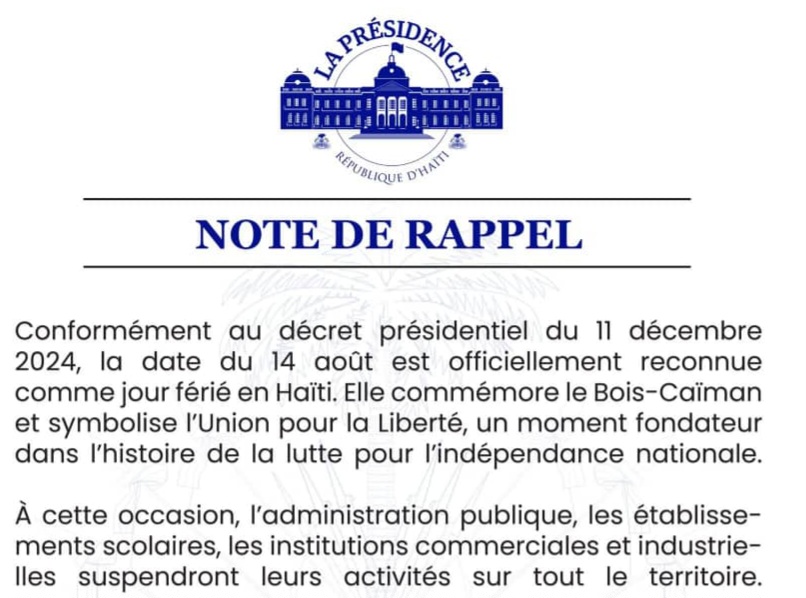 Conformément au décret présidentiel du 11 décembre 2024, le 14 août est désormais un jour férié en Haïti, a annoncé la présidence dans un communiqué. Cette date historique commémore la cérémonie du Bois-Caïman, événement majeur qui incarne l’Union pour la Liberté et marque le début de la révolte pour l’indépendance nationale. Elle symbolise les fondements de la résistance haïtienne et la quête d’émancipation des peuples.