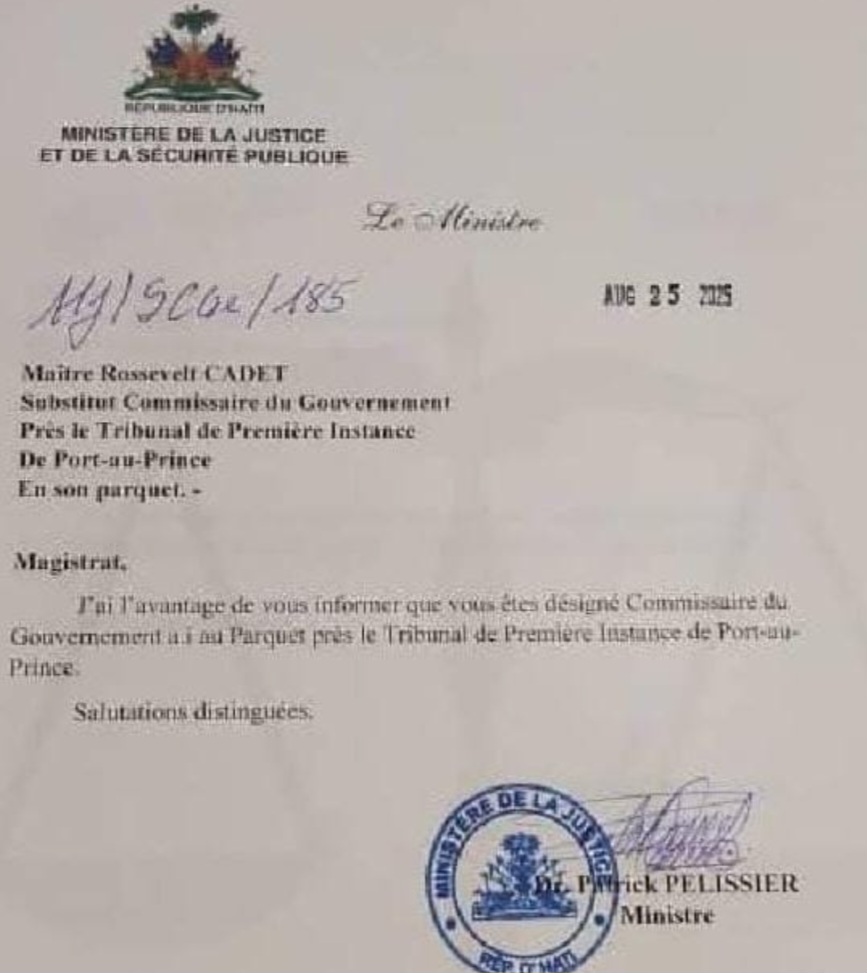 Ce lundi 25 août 2025, Me Roosevelt Cadet, jusque-là substitut du commissaire du gouvernement, a été désigné pour occuper le poste de chef du parquet. Cette décision inattendue suscite des interrogations au sein du système judiciaire.