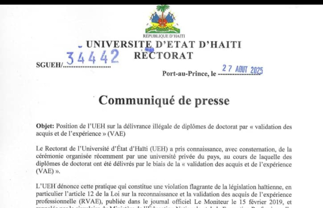 Le Rectorat de l’Université d’État d’Haïti (UEH) a, dans une note rendue publique le mercredi 27 août, exprimé sa vive préoccupation face à une récente cérémonie organisée par une université privée haïtienne, lors de laquelle des diplômes de doctorat ont été illégalement délivrés via le mécanisme de “validation des acquis de l’expérience ” (VAE). Cette pratique, selon l’UEH, viole clairement la législation haïtienne, notamment l’article 12 de la Loi sur la reconnaissance et la validation des acquis professionnels (RVAE).