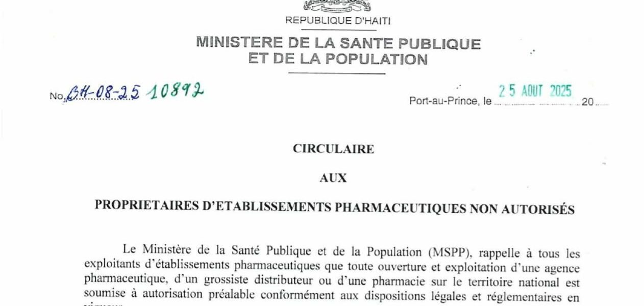 Le Ministère de la Santé Publique et de la Population (MSPP) a publié une circulaire ce mardi 2 septembre 2025 pour rappeler que toute ouverture ou exploitation d’une agence pharmaceutique, d’un grossiste ou d’une pharmacie sur le territoire national doit être soumise à une autorisation préalable. Cette mesure vise à garantir le respect des normes légales et sanitaires en vigueur, dans le but de protéger la santé publique.