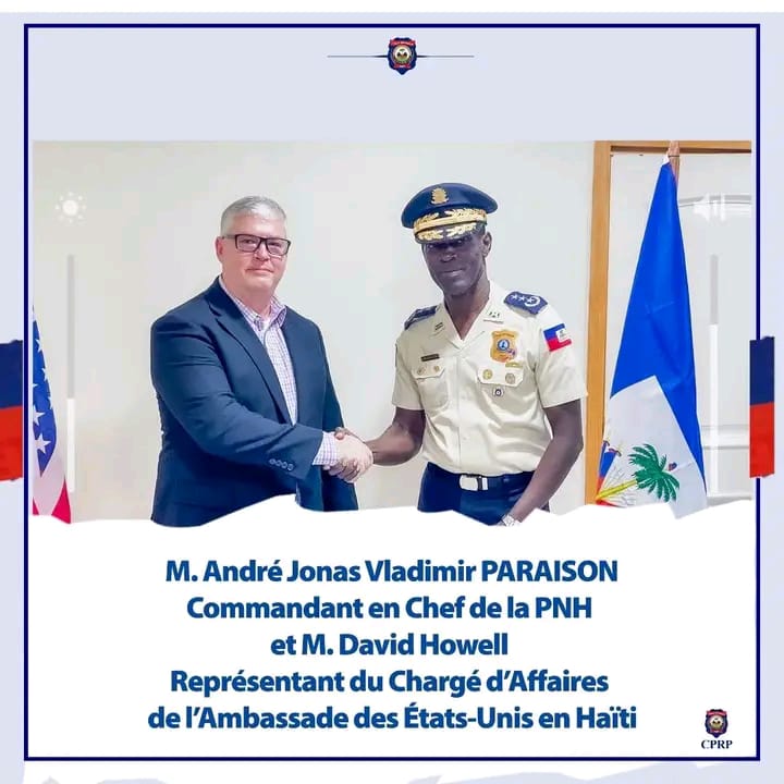 Le Commandant en Chef de la Police Nationale d’Haïti (PNH), André Jonas Vladimir Paraison, entouré des hauts responsables de l’institution, a accueilli le mardi 23 septembre 2025 M. David Howell, Assistant Chef de la mission diplomatique des États‑Unis en Haïti, représentant du Chargé d’Affaires de l’Ambassade américaine, à la Direction Générale de la PNH, à Clercine 8.