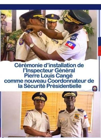Le 3 novembre 2025, une cérémonie officielle s’est tenue au Palais national pour marquer l’installation du nouveau Coordonnateur de la Sécurité Présidentielle, l’Inspecteur Général Pierre Louis Cangé. Ce dernier, ancien Commissaire Divisionnaire, a été promu au grade d’Inspecteur Général et a été installé dans ses nouvelles fonctions par le Commandant en Chef de la Police Nationale d’Haïti (PNH), M. André Jonas Vladimir Paraison.