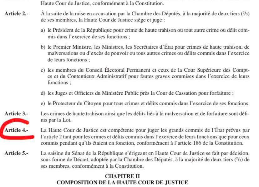 L’article 4 instaure une protection lourde de conséquences : les grands commis de l’État ne pourraient être poursuivis que devant la Haute Cour de justice pour les crimes et délits commis dans l’exercice de leurs fonctions. En apparence, il s’agit d’un cadre juridique. En réalité, cela restreint drastiquement l’accès aux poursuites ordinaires et renforce un système où les hauts responsables deviennent presque intouchables.