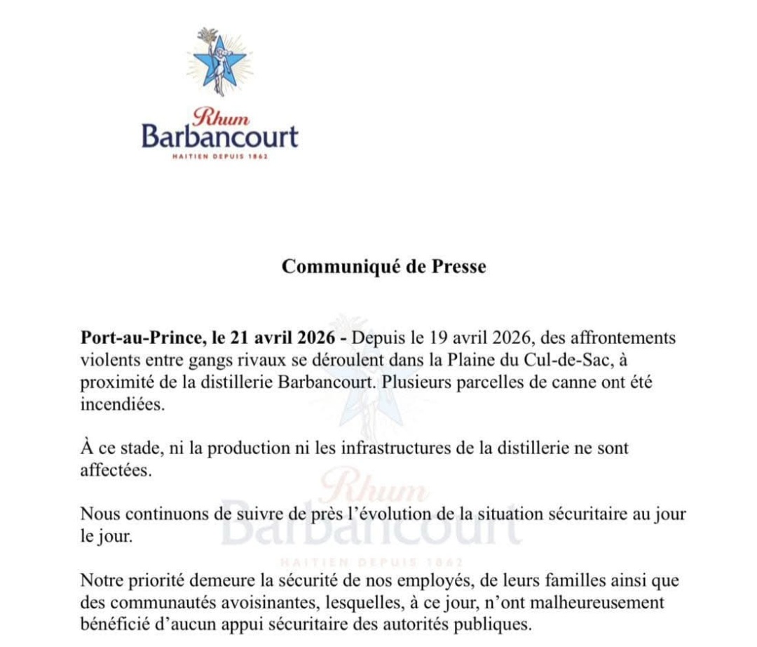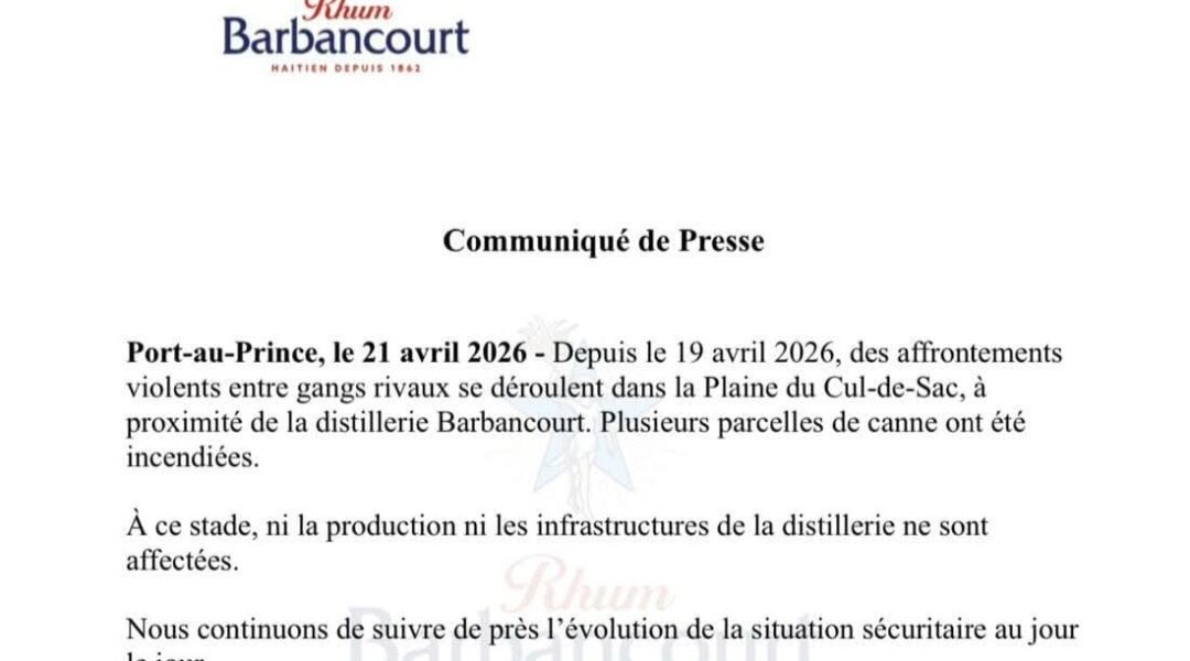 Depuis le 19 avril, des échanges de tirs opposent des gangs rivaux à proximité du site de production de Barbancourt. Plusieurs parcelles de canne à sucre ont été réduites en cendres, alimentant la crainte d’un impact économique à court terme sur la filière. Malgré ce climat tendu, la distillerie indique que ni ses infrastructures ni sa capacité de production ne sont affectées, tout en suivant de près l’évolution de la situation sécuritaire au jour le jour.