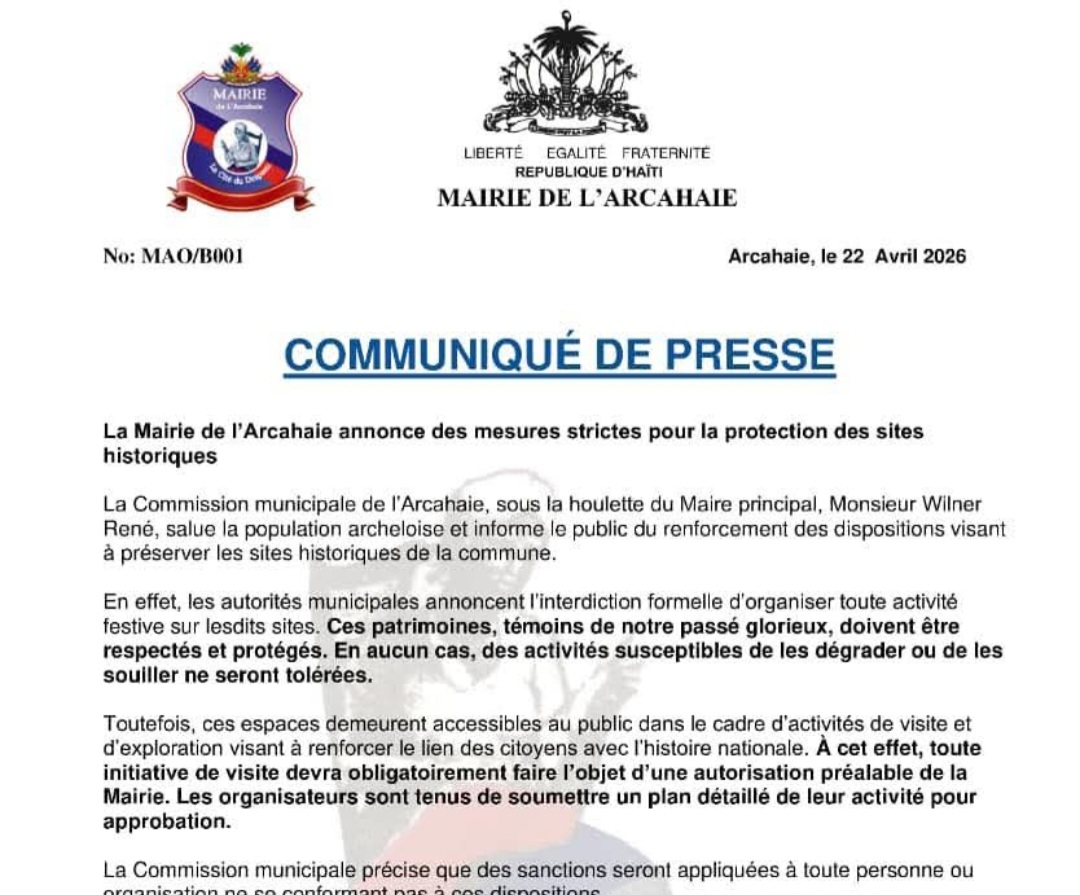 Dans un communiqué publié le 22 avril 2026, l’administration municipale dirigée par le maire Wilner René met en avant la nécessité de renforcer la protection des lieux emblématiques de la commune. Désormais, toute activité festive est formellement interdite sur ces espaces considérés comme des témoins du passé glorieux du pays. Les autorités insistent sur le respect strict de ces sites, dénonçant toute initiative susceptible de les dégrader ou de les souiller.