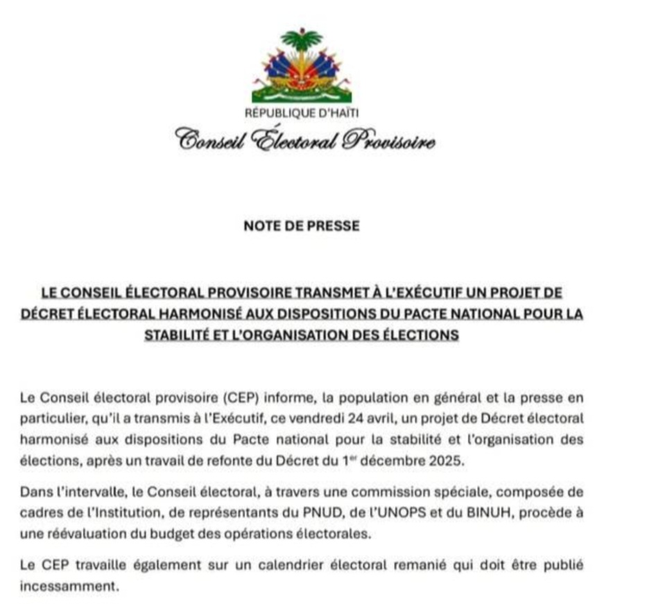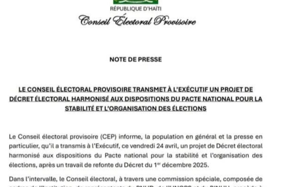 Le Conseil Électoral Provisoire (CEP) a annoncé, dans une note de presse publiée ce vendredi 24 avril 2026, la transmission à l’Exécutif d’un projet de décret électoral révisé. Ce document, fruit d’un travail de refonte du décret du 1er décembre 2025, a été harmonisé avec les dispositions du Pacte national pour la stabilité et l’organisation des élections. Cette démarche s’inscrit dans une volonté de doter le pays d’un cadre légal plus cohérent en vue de la tenue des prochains scrutins.