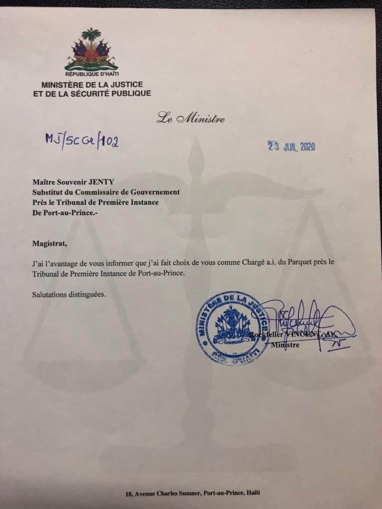 Dans une correspondance parue ce jeudi 23 juillet, Me. Souvenir JENTY est nommé chargé a.i du parquet près le Tribunal de Première Instance de Port-au-Prince par le Ministre de la Justice et de la Securité Publique (MJSP) Me. Rockfeller Vincent.