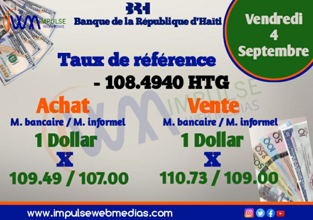 Impulse Web Medias vous présente chaque matin, le taux de référence de la Banque de la République d’Haiti (BRH), les taux à l’achat et à la vente dans les banques commerciales et sur le marché informel pour mieux comprendre les opérations de change.