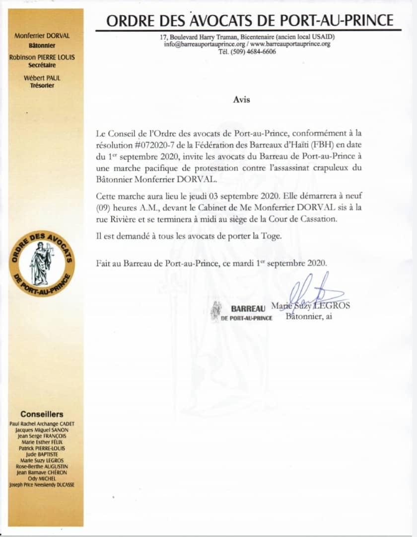 Le Conseil de l’Ordre des Avocats de Port-au-Prince dit inviter les avocats du Barreau de Port-au-Prince à une marche pacifique de protestation contre l’assassinat crapuleux du Bâtonnier, Me Monferrier Dorval le 28 août dernier, lit-on dans une note parue ce mardi 1er septembre 2020.