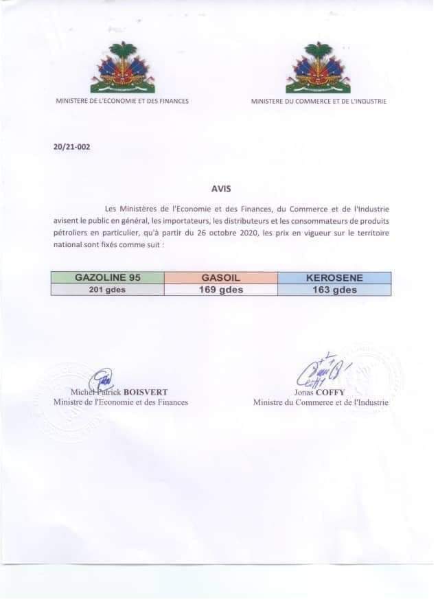Jan Prezidan Jovenel Moïse te pwomèt li 20 oktòb ki sot pase a, gen yon pase men ki fèt nan pri pwodui petwolye yo sou mache lokal la. Nan yon avi Ministè Ekonomi ak Finans nan tèt kole ak Ministè komès mete deyò jounen vandredi 23 oktòb la, dizèl la ki te vann 174 goud pase a 169 goud, kerozèn nan ki te vann 173 goud koute 163 goud. Gazolin nan toujou rete nan 201 goud.