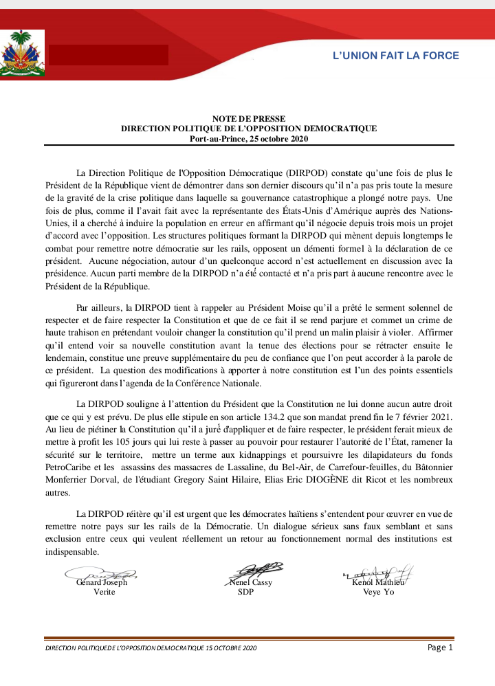 Daprè DIRPOD la, pa gen okenn akò k ap negosye avèk la prezidans. Mete sou sa, pa gen okenn pati ki manm DIRPOD la yo te kontakte ni ki te chita pale ak prezidan Repiblik la. Yon lòt bò, Direksyon Politik Opozisyon Demokratik la fè lokatè Palè Nasyonal la sonje li te prete sèman pou l respekte ak pou fè respekte konstitisyon an. Nan sans sa, li fè tèt li pase pou yon trèt epi li komèt yon krim ‘’haute trahison’’ lè l pretann li kapab chanje konstitisyon an li pran plezi ap pase anba pye.