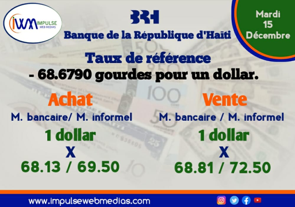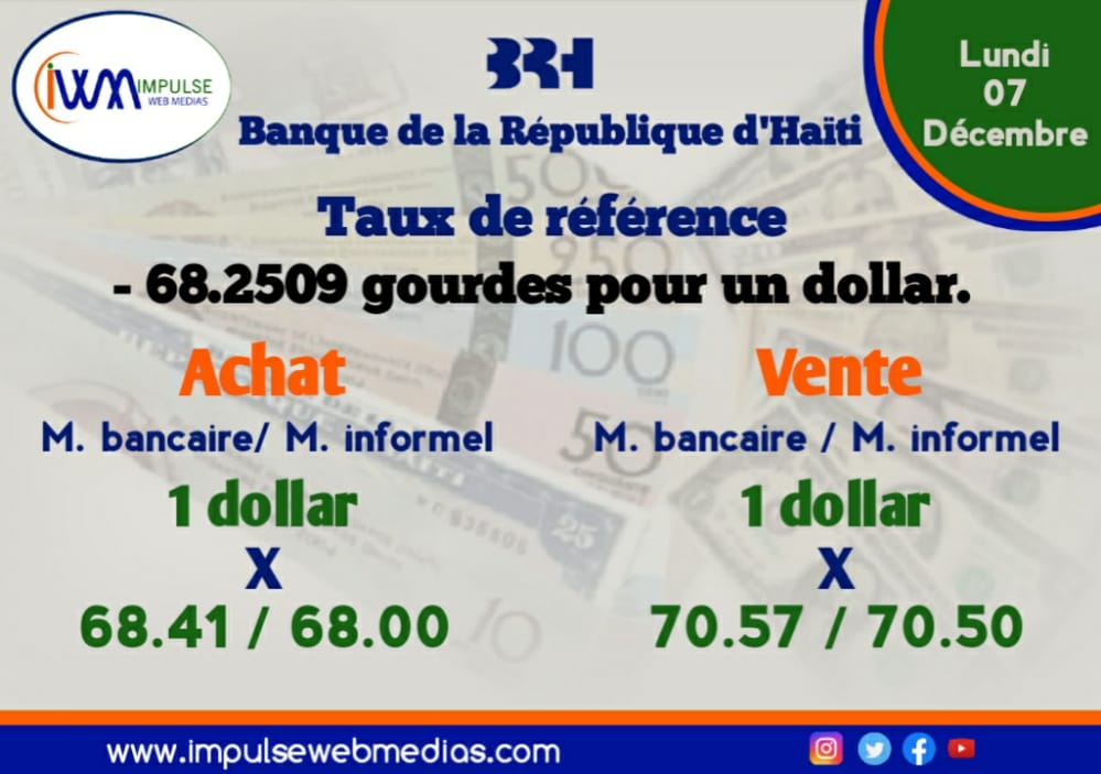 Impulse Web Medias vous présente chaque matin, le taux de référence de la Banque de la République d’Haiti (BRH), les taux à l’achat et à la vente dans les banques commerciales et sur le marché informel via un format simple et précis pour une meilleure compréhension.