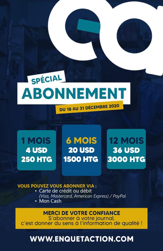 Notons que le Journal “Enquet’Action” offre un spécial abonnement allant du 18 au 31 décembre 2020. Le prix pour un mois est de 4 US ou 250 G, celui de 6 mois est de 20 US ou 1500 G. Par contre si vous optez plutôt pour un abonnement de 12 mois, vous aurez à verser un montant de 36 US ou 3000 gourdes.