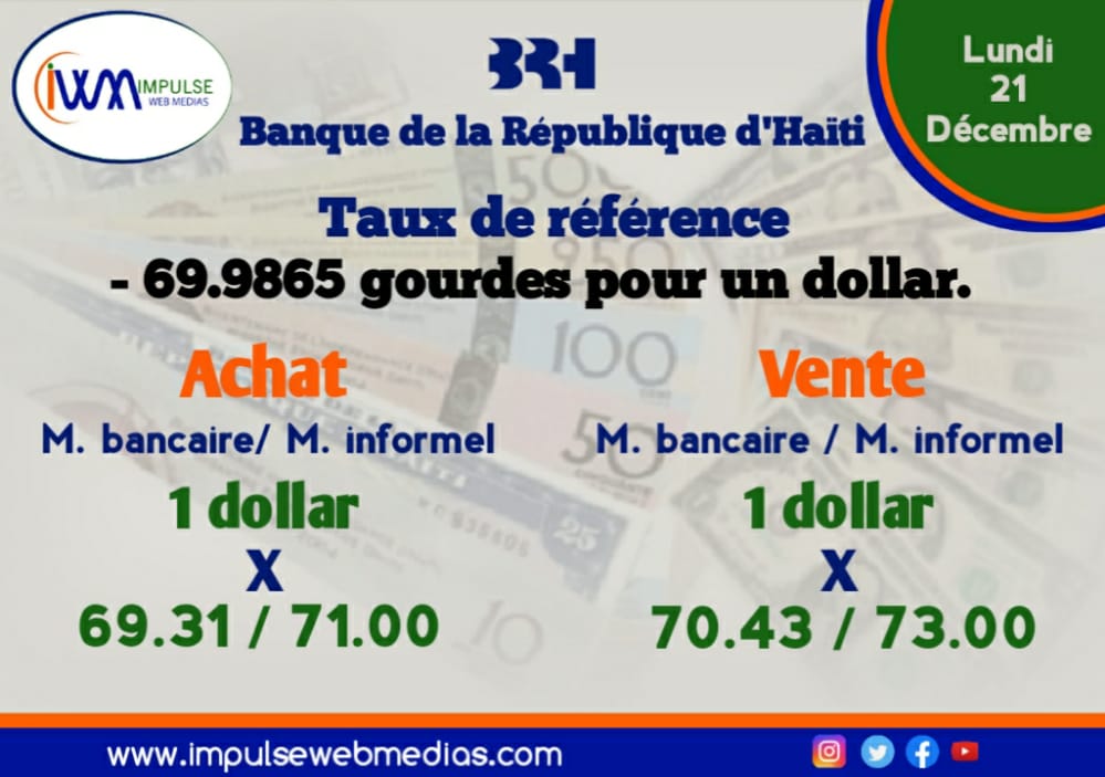 Impulse Web Medias vous présente chaque matin, le taux de référence de la Banque de la République d’Haiti (BRH), les taux à l’achat et à la vente dans les banques commerciales et sur le marché informel via un format simple et précis pour une meilleure compréhension.