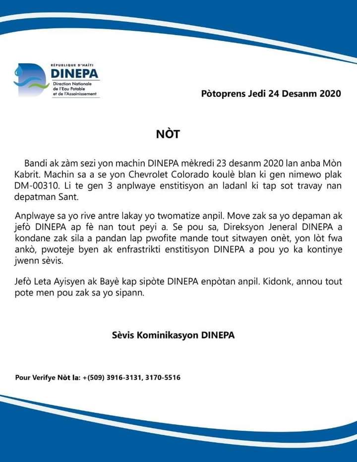 Des bandits armés ont saisi un véhicule de la DINEPA le mercredi 23 décembre à Morne à Cabri. Ce véhicule est un Chevrolet de couleur blanche immatriculé DM- 00310, lit-on dans une note émise par le service de communication de la DINEPA ce jeudi 24 décembre.